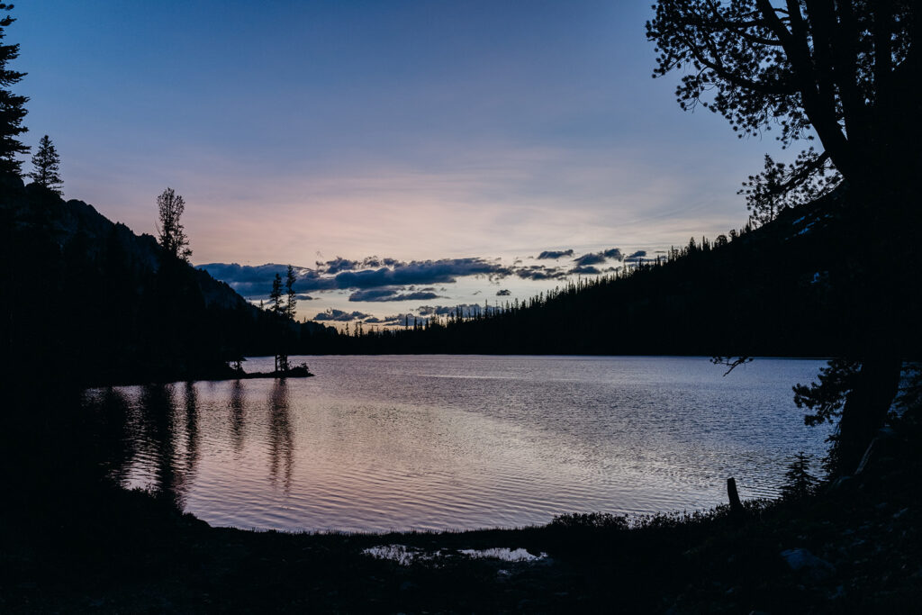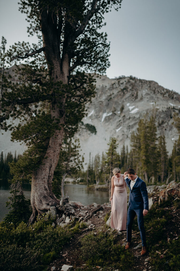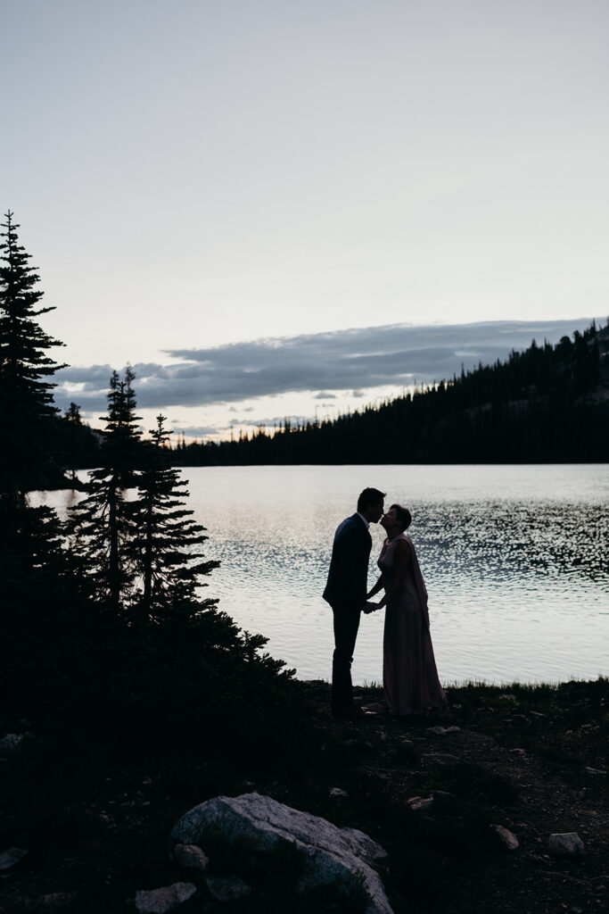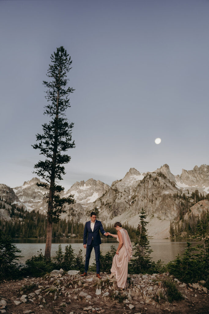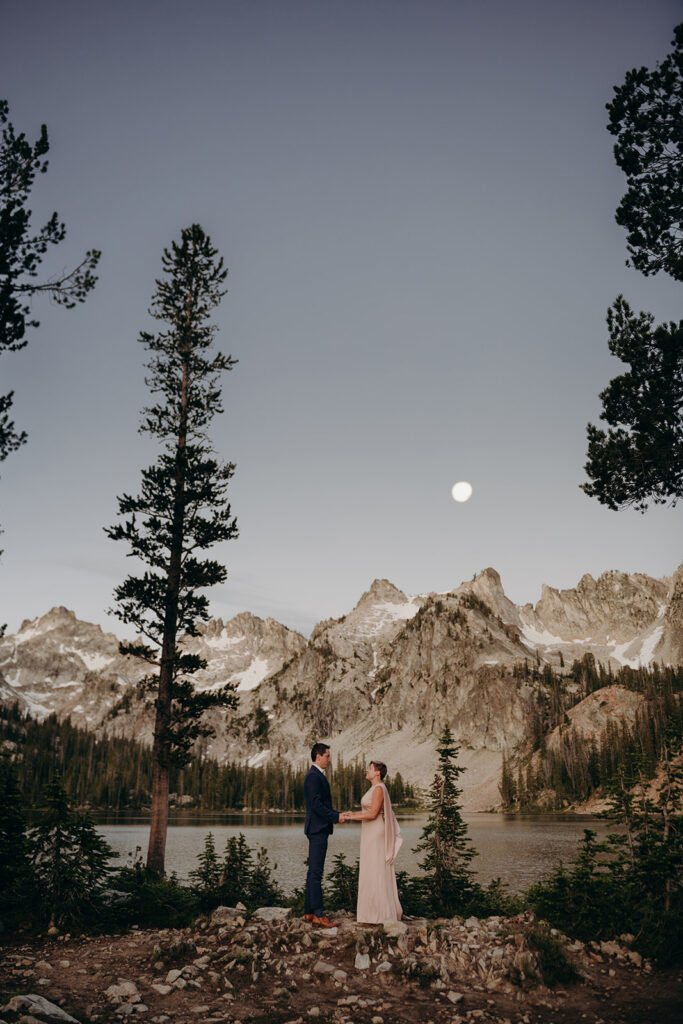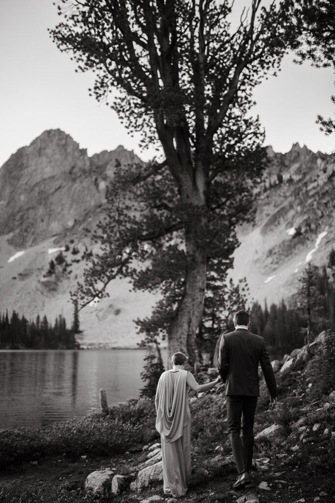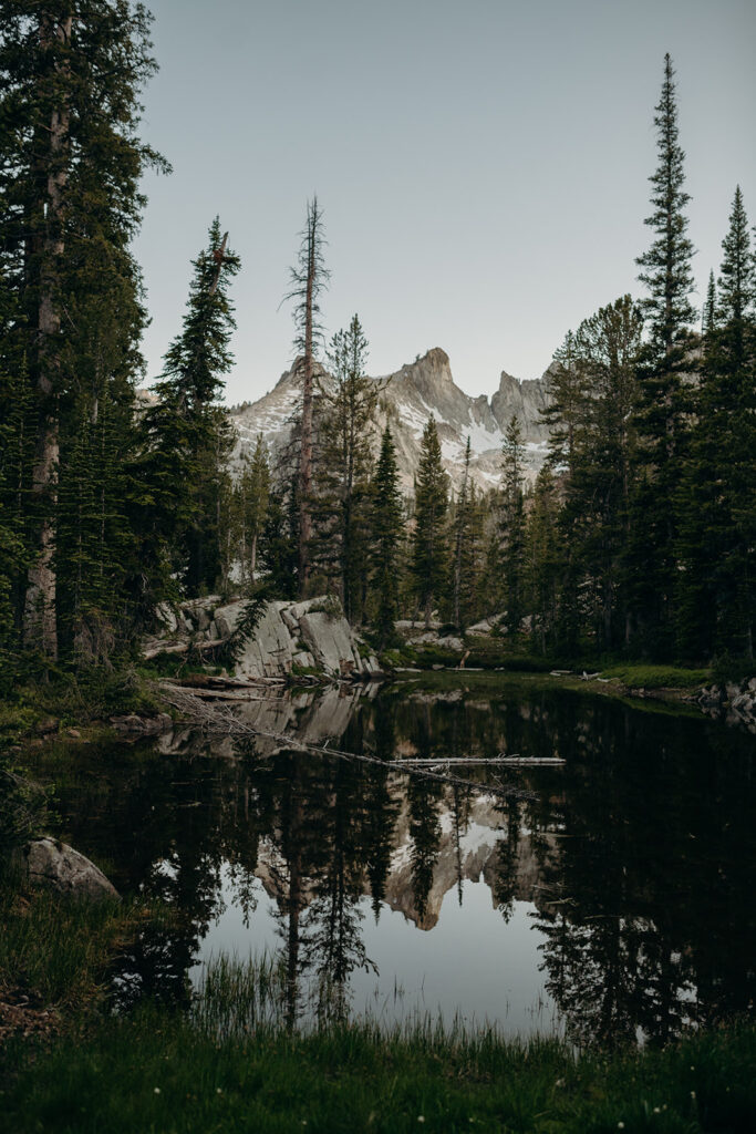 Michelle + Luke’s wedding was a great adventure. They dreamed of having their wedding portraits captured in their favourite spot in the Sawtooth Mountains – Alice Lake. So with a camera bag on my back, and Luke valiantly carrying our camping gear, we hiked to the remote Alice Lake, where we camped out overnight. At sunrise the next day, we woke to capture Michelle + Luke’s portraits in the glorious landscape.