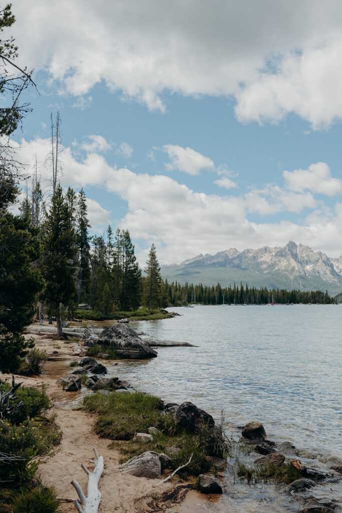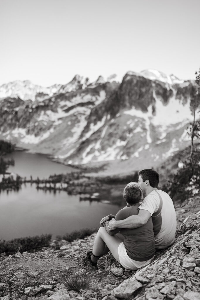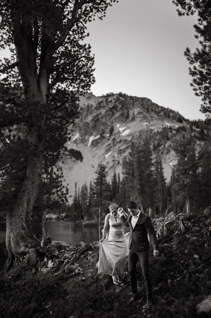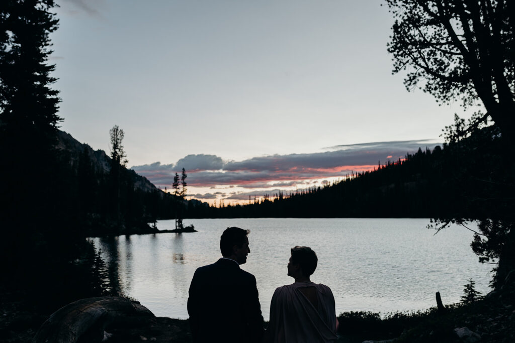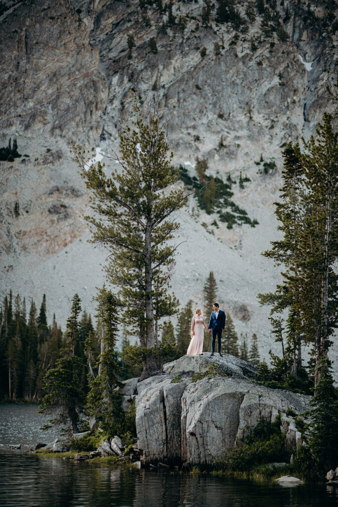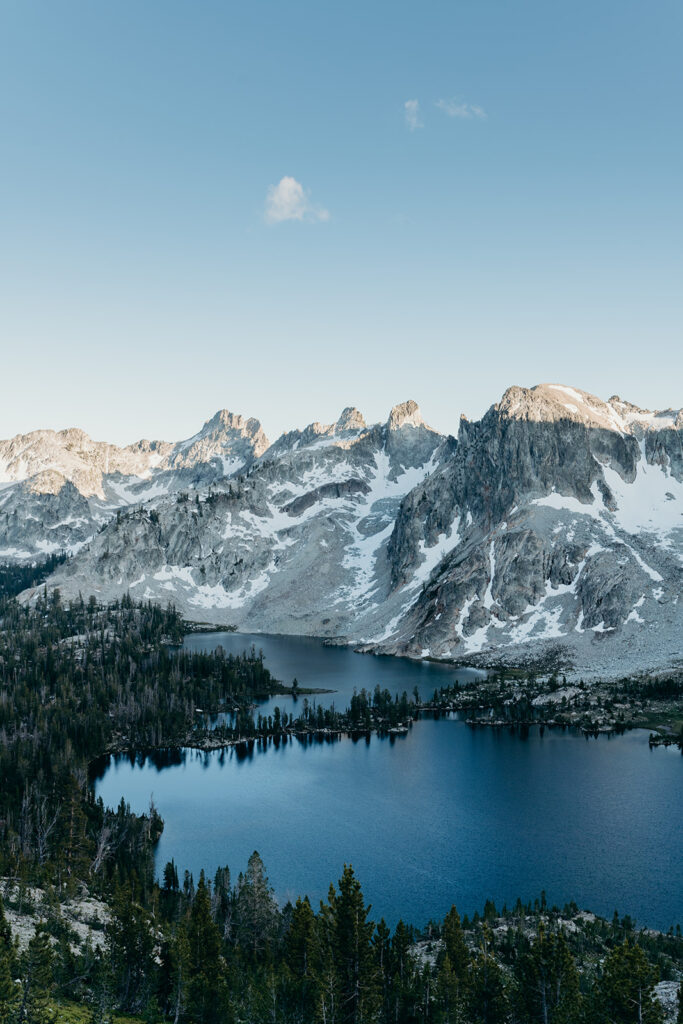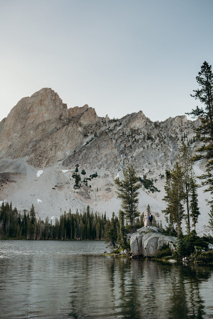 Michelle + Luke’s wedding was a great adventure. They dreamed of having their wedding portraits captured in their favourite spot in the Sawtooth Mountains – Alice Lake. So with a camera bag on my back, and Luke valiantly carrying our camping gear, we hiked to the remote Alice Lake, where we camped out overnight. At sunrise the next day, we woke to capture Michelle + Luke’s portraits in the glorious landscape.