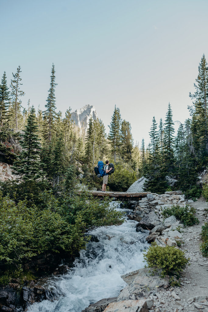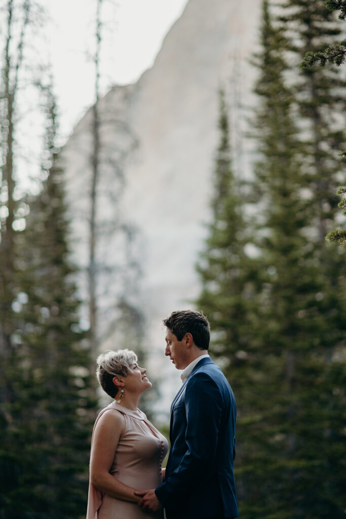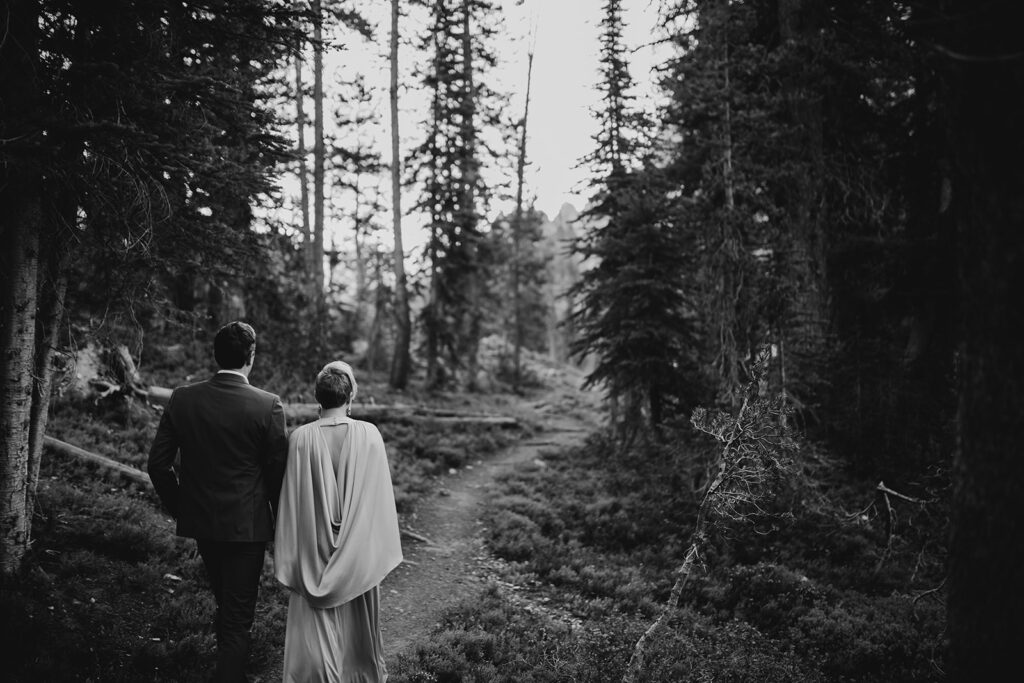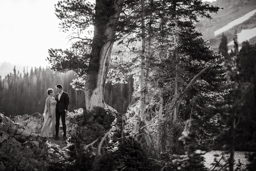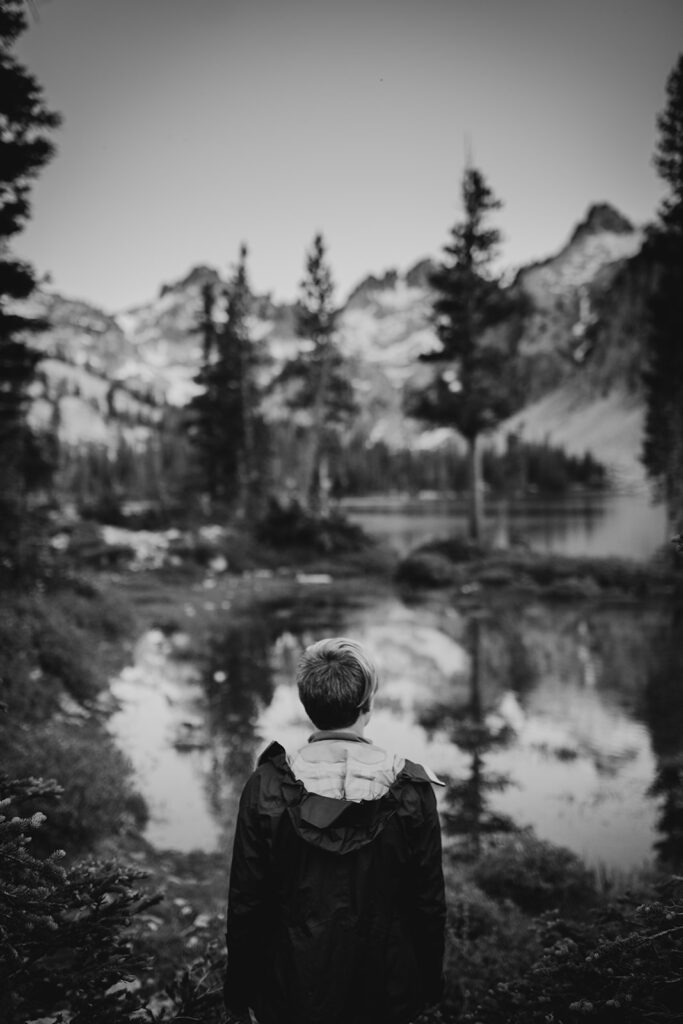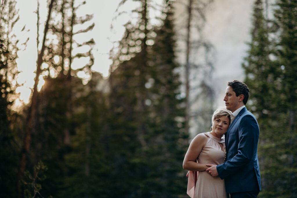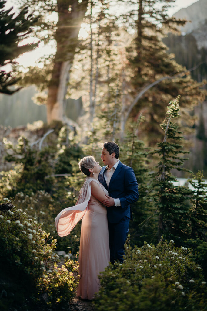 Michelle + Luke’s wedding was a great adventure. They dreamed of having their wedding portraits captured in their favourite spot in the Sawtooth Mountains – Alice Lake. So with a camera bag on my back, and Luke valiantly carrying our camping gear, we hiked to the remote Alice Lake, where we camped out overnight. At sunrise the next day, we woke to capture Michelle + Luke’s portraits in the glorious landscape.